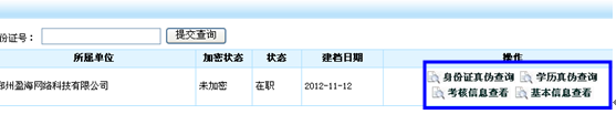 本单位档案查询:输入姓名和身份证号码就可以看到要查询人的档案,同时还可以对查询人的基本信息和考核信息查看,并可以进行身份和学历的认证。